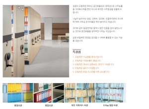 • 2. 모빌랙은 작업능률이 좋습니다.종래 고정서고의 보관 스페이스에서는 작업환경이 좋지 않습니다. 모빌랙은 한정된 면적에서 보관시 고정서고보다 보관 스페이스가 대폭 증가되므로 작업능률이 좋으며, 환경도 좋아집니다.